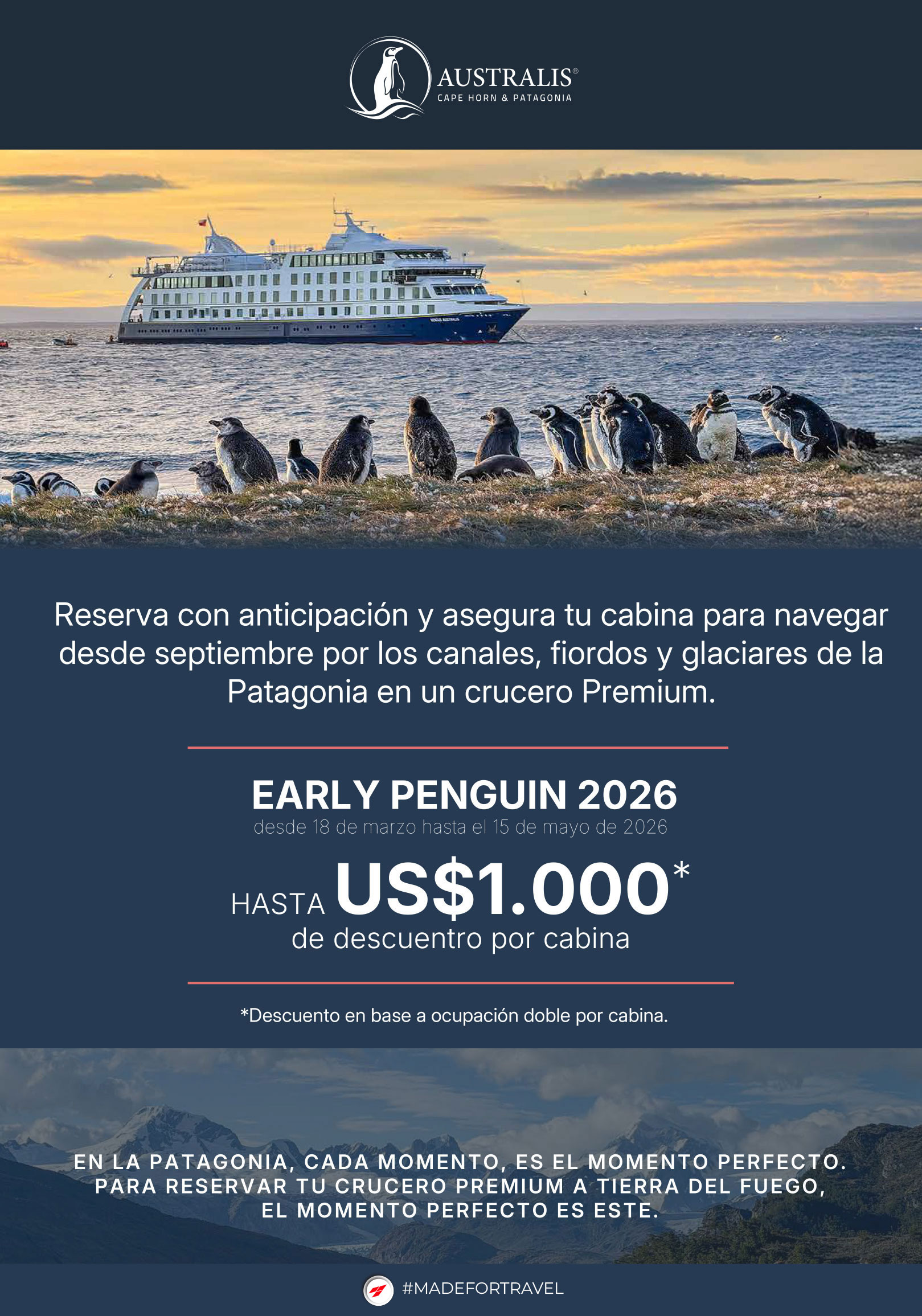 Hasta US$1,000* de DESCUENTO para viajar a la PATAGONIA